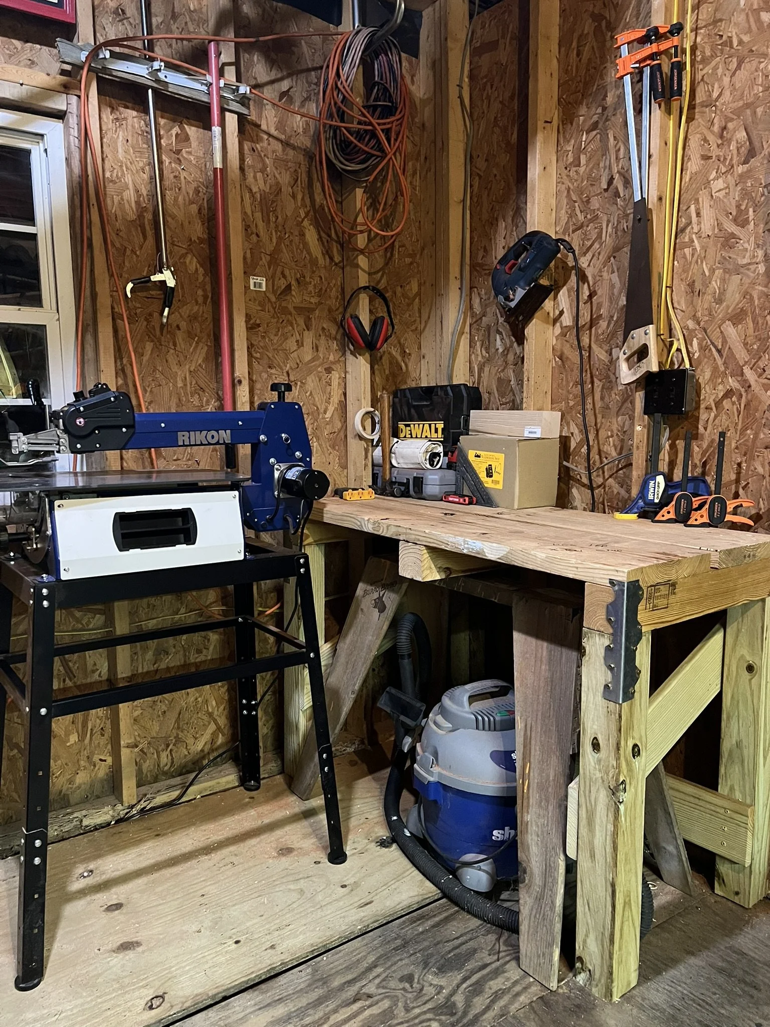 Step into my workshop and let me tell you about my process and who I am. I work out of my parents' tool shed and garage, using workbenches where I hand-clamp every piece of wood. I use three simple but essential tools to get these carvings to your doorstep.
